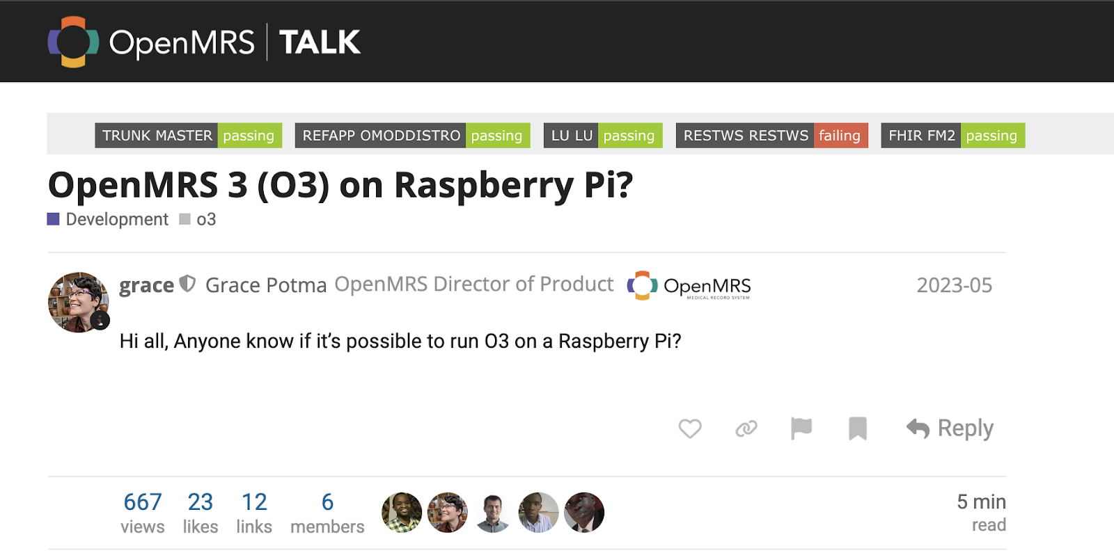 Figure 1: The first question on Talk by Grace Potma about OpenMRS 3 (O3) on Raspberry Pi, which emphasised the vision of EMR4All in 2023 to become a reality.